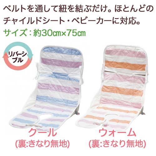 ベルトを通してひもを結ぶだけ。ほとんどのチャイルドシート・ベビーカーに対応。リバーシブルに使えます。