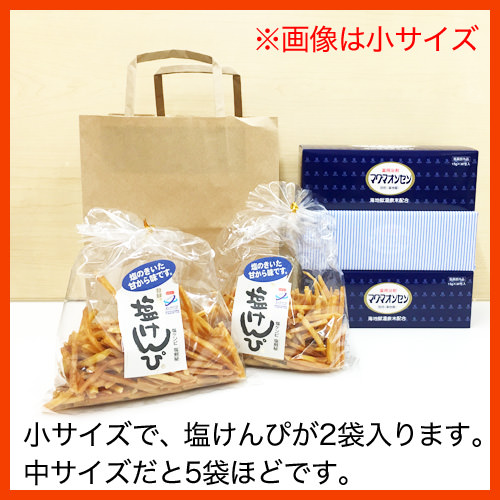 小サイズで、塩けんぴが2袋入ります。中サイズだと5袋ほどです。